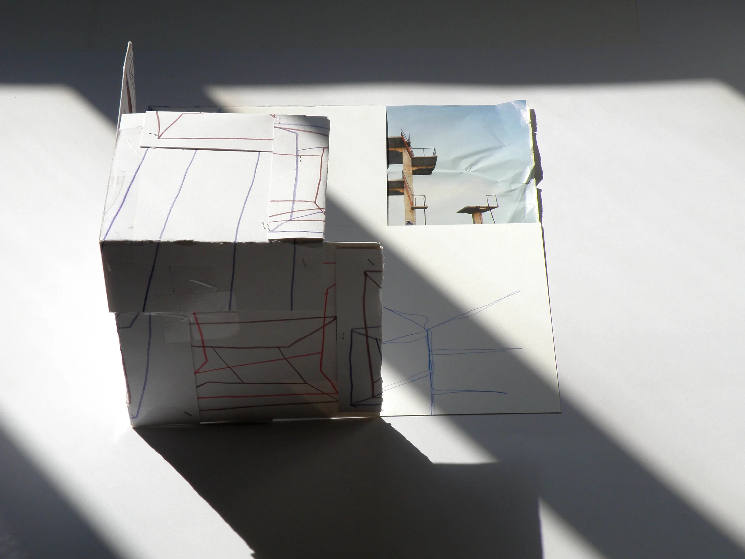 Ne percorro lentamente il fondo cercando il riflesso dell’acqua mancante. Mi piace osservare l’inclinazione del pavimento azzurrato che determina le variazioni di profondità. Cammino dalla zona in cui l’acqua è alta un metro fino a raggiungere la fossa che accoglie il corpo del tuffatore saltato dal trampolino. Da quel punto - la zona più bassa della vasca - il prato è invisibile e l’orizzonte esterno scompare. Foglie rinsecchite si avvitano in complicati mulinelli.
