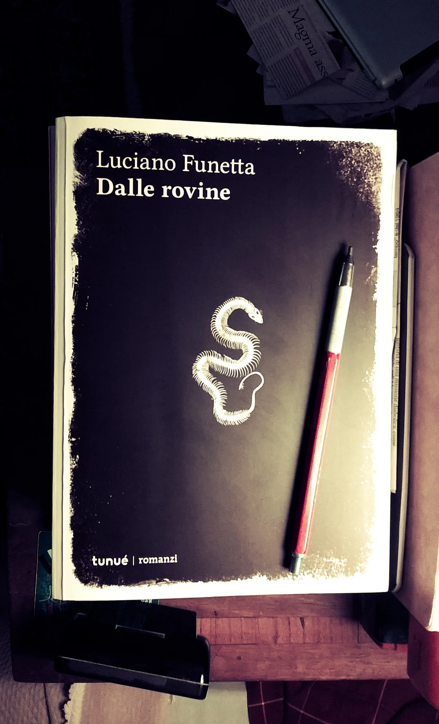 Già a partire dall'epigrafe collocata in apertura di Dalle rovine, Luciano Funetta - giovane autore di questo sbalorditivo romanzo - dichiara molti dei suoi intenti e ci lascia spiare in anticipo molti dei suoi demoni. Si tratta di una frase di Joseph Conrad (“Non c'è uomo qui – mi segue? non c'è uomo che reggerebbe a una vita fatata”) che unisce un tema esistenziale ormai classico della modernità, la fatica di vivere, ad una corrente magica, con una domanda interna relativa al seguire un pensiero, il tutto in forma di dichiarazione negativa rivolta ad un ipotetico interlocutore.